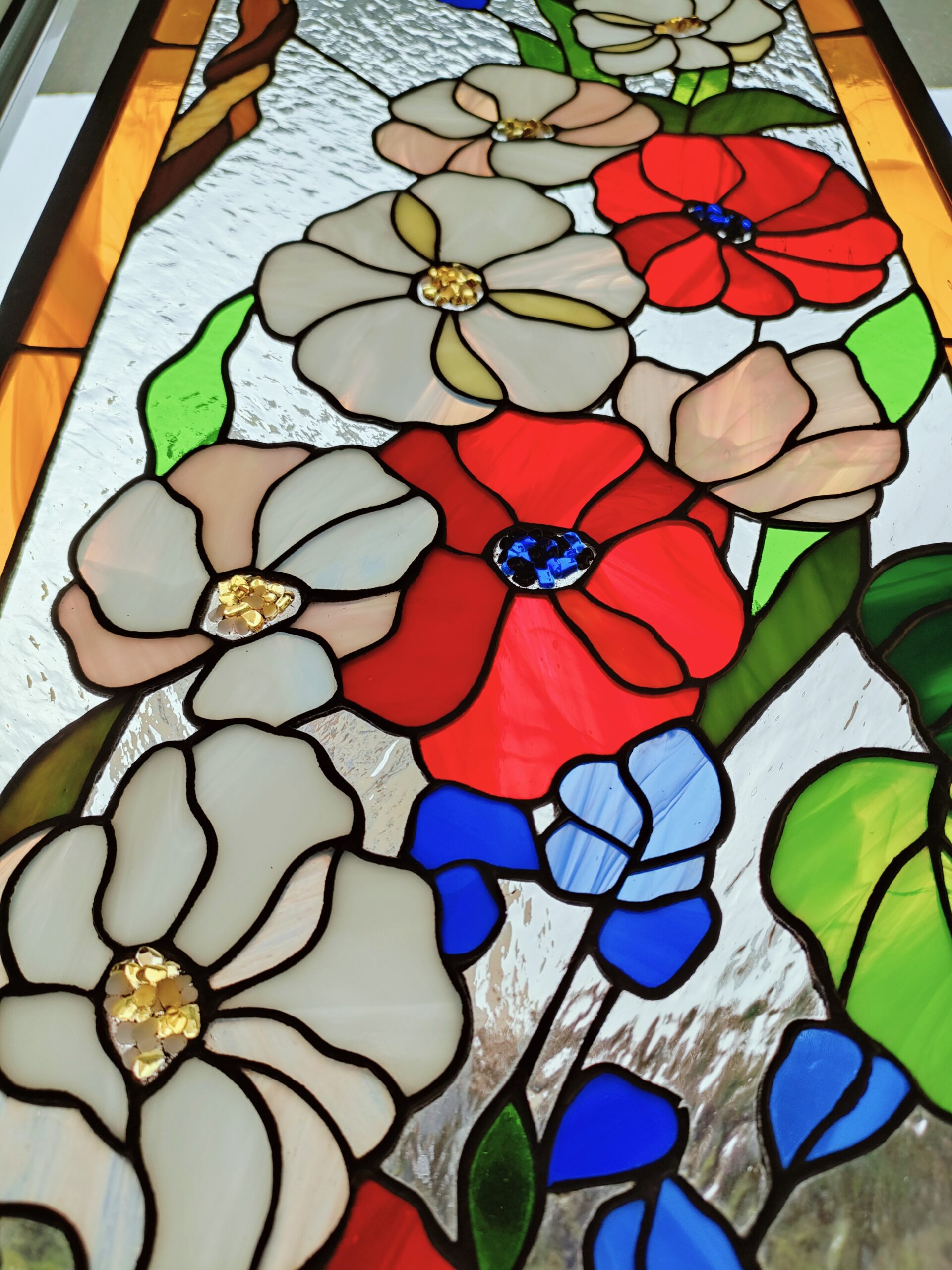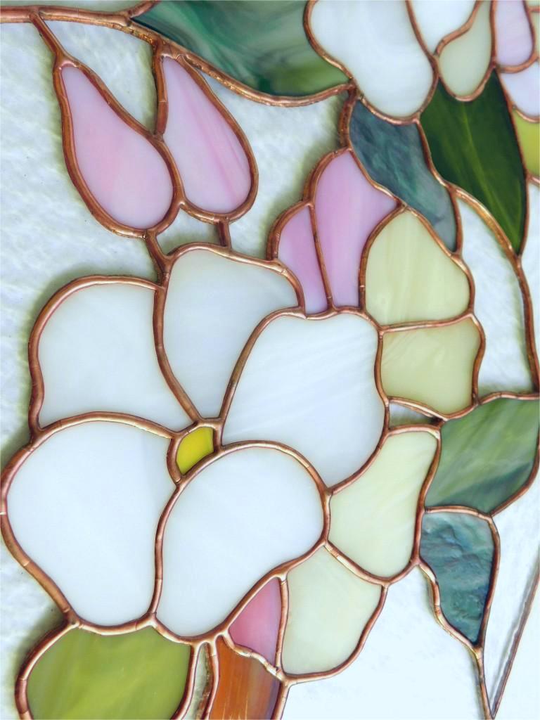 Przykład zrobionych w tej technice witraży: Kwitniąca Jabłoń, Czułość Życia.